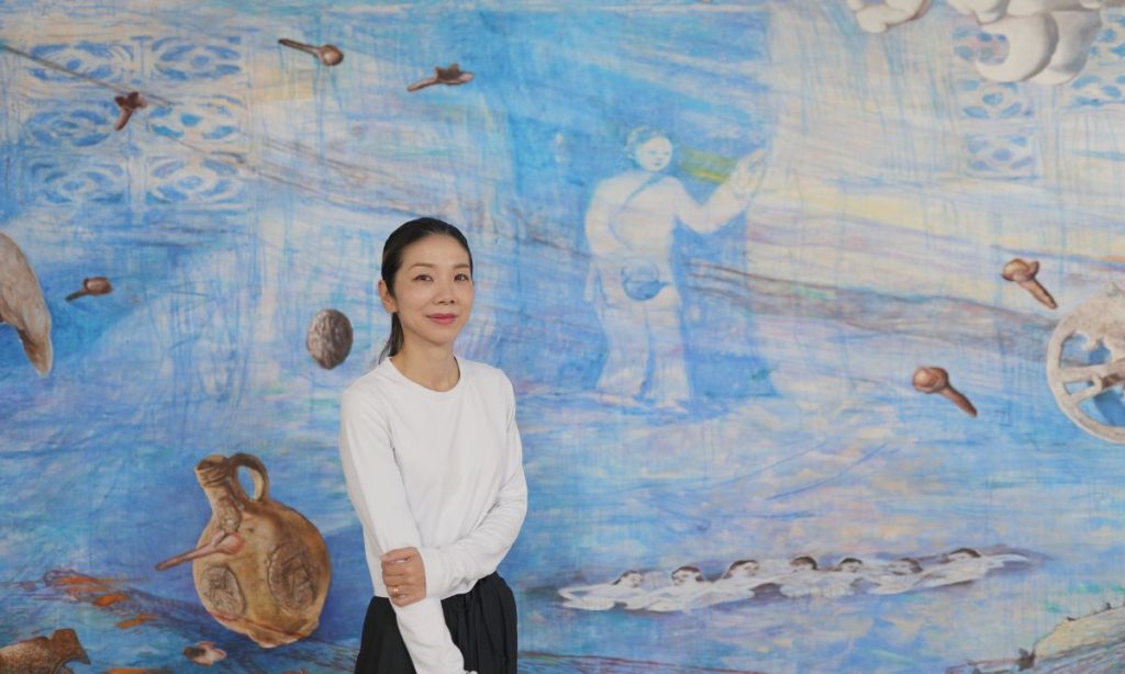 The Sea is Barely Wrinkled (Laut Nyaris Tak Beriak) menyusuri ‘peta waktu’ yang menghubungkan masa lalu kolonial Indonesia, tantangan ekologis masa kini, dan mitologi lokal. Terinspirasi dari tragedi tenggelamnya kapal Batavia pada 1628, pameran ini menyoroti warisan kolonial yang masih berlangsung serta isu-isu lingkungan yang mendesak di Jakarta. Pameran ini juga menampilkan figur mitologis Indonesia seperti Dewi Sri dan Nyai Roro Kidul sebagai narasi tandingan terhadap paradigma kolonial yang antroposentris. Melalui pameran ini, Imazu mengaburkan batas antara sejarah, mitos, dan fiksi, mengajak kita merenungkan keterhubungan manusia dengan sejarah berlapis, alam, dan waktu.
