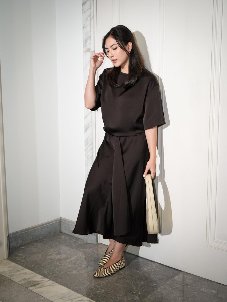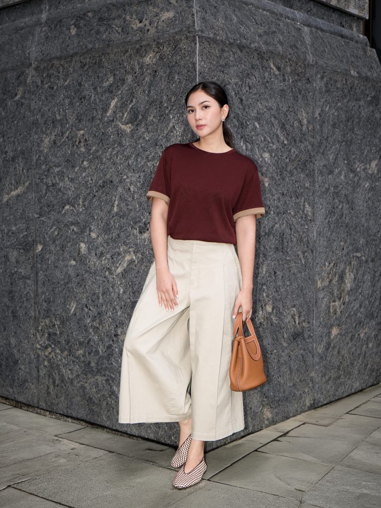 Saat suasana berubah formal, Jessica memilih Blus Pendek Satin Oversize Lengan 1/2 dipadukan dengan Rok Panjang Satin yang senada. Kilau lembut material satin dan potongan yang fluid menghadirkan nuansa kemewahan yang effortless. Sebagai penutup, Jessica tampil santai namun tetap chic melalui kombinasi T-Shirt Rajut Boxy dengan detail kerah kontras, dipadukan dengan Kulot Katun.